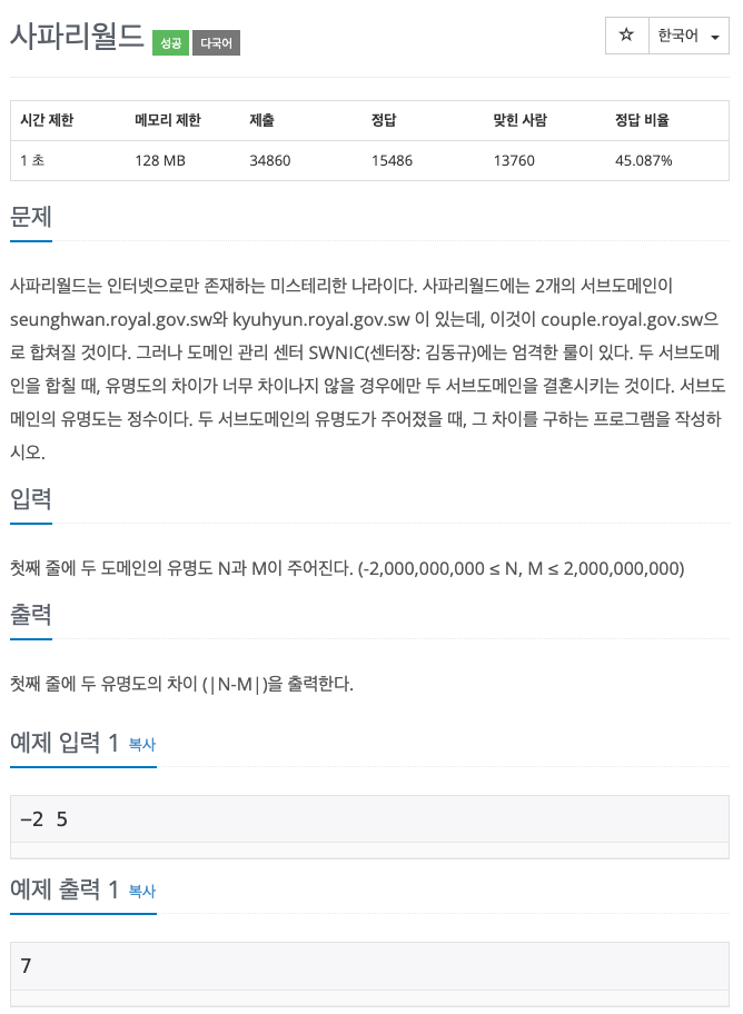 사파리월드는 인터넷으로만 존재하는 미스테리한 나라이다. 사파리월드에는 2개의 서브도메인이 seunghwan.royal.gov.sw와 kyuhyun.royal.gov.sw 이 있는데, 이것이 couple.royal.gov.sw으로 합쳐질 것이다. 그러나 도메인 관리 센터 SWNIC(센터장: 김동규)에는 엄격한 룰이 있다. 두 서브도메인을 합칠 때, 유명도의 차이가 너무 차이나지 않을 경우에만 두 서브도메인을 결혼시키는 것이다. 서브도메인의 유명도는 정수이다. 두 서브도메인의 유명도가 주어졌을 때, 그 차이를 구하는 프로그램을 작성하시오.