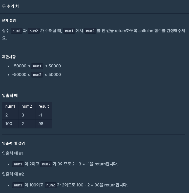 정수 num1과 num2가 주어질 때, num1에서 num2를 뺀 값을 return하도록 soltuion 함수를 완성해주세요.