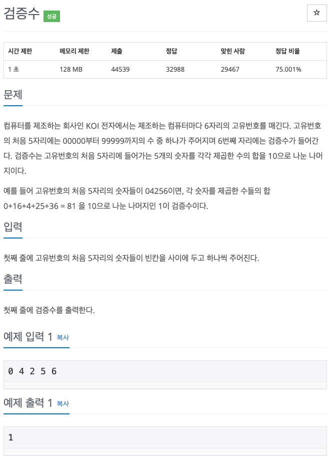 컴퓨터를 제조하는 회사인 KOI 전자에서는 제조하는 컴퓨터마다 6자리의 고유번호를 매긴다. 고유번호의 처음 5자리에는 00000부터 99999까지의 수 중 하나가 주어지며 6번째 자리에는 검증수가 들어간다. 검증수는 고유번호의 처음 5자리에 들어가는 5개의 숫자를 각각 제곱한 수의 합을 10으로 나눈 나머지이다.