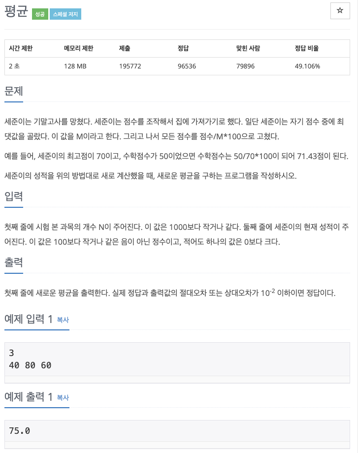 세준이의 성적을 위의 방법대로 새로 계산했을 때, 새로운 평균을 구하는 프로그램을 작성하시오.