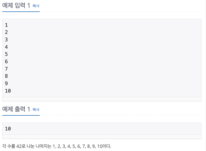 수 10개를 입력받은 뒤, 이를 42로 나눈 나머지를 구한다. 그 다음 서로 다른 값이 몇 개 있는지 출력하는 프로그램을 작성하시오.