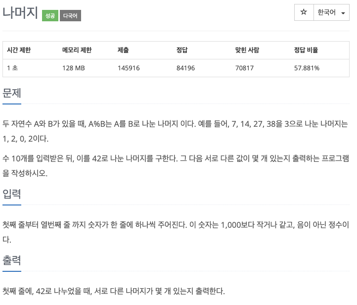 첫째 줄에, 42로 나누었을 때, 서로 다른 나머지가 몇 개 있는지 출력한다.