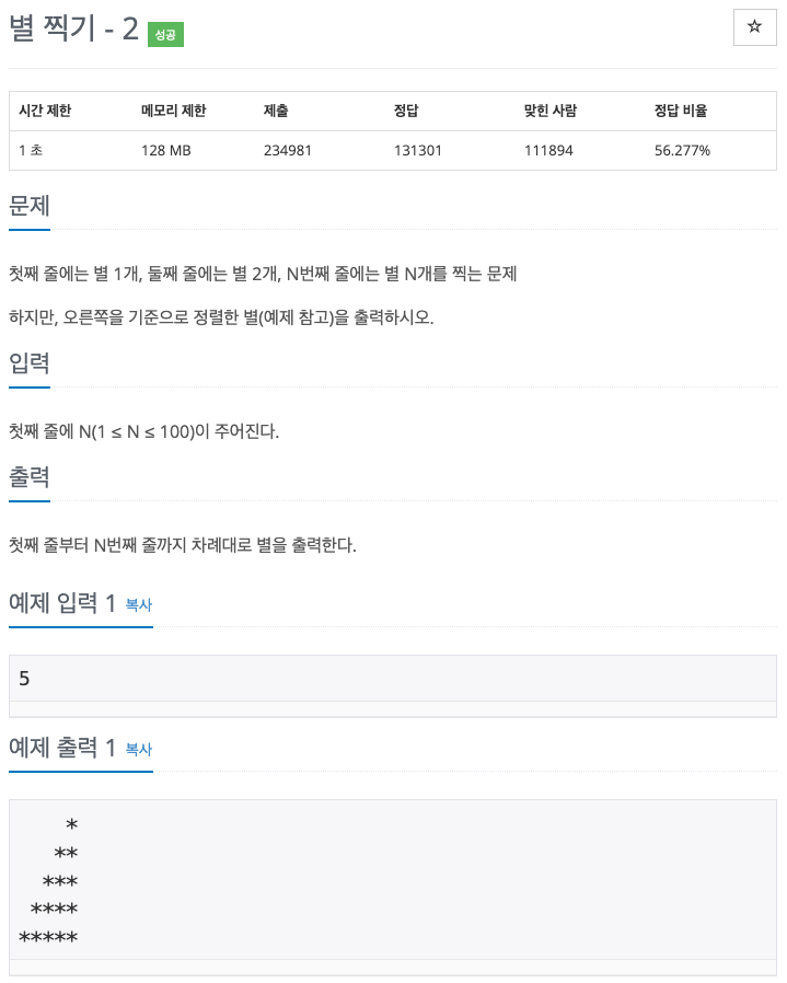 첫째 줄에는 별 1개, 둘째 줄에는 별 2개, N번째 줄에는 별 N개를 찍는 문제