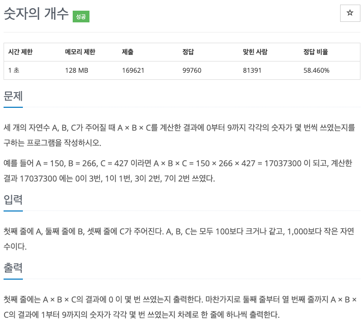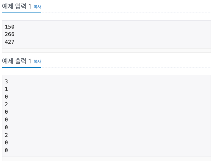 예를 들어 A = 150, B = 266, C = 427 이라면 A × B × C = 150 × 266 × 427 = 17037300 이 되고, 계산한 결과 17037300 에는 0이 3번, 1이 1번, 3이 2번, 7이 2번 쓰였다.