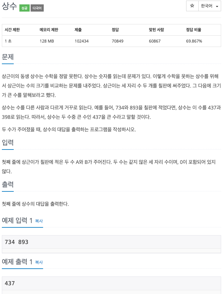 상수는 수를 다른 사람과 다르게 거꾸로 읽는다. 예를 들어, 734와 893을 칠판에 적었다면, 상수는 이 수를 437과 398로 읽는다. 따라서, 상수는 두 수중 큰 수인 437을 큰 수라고 말할 것이다.