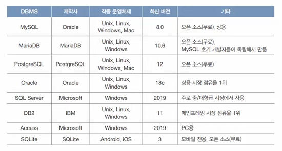 관계형 DBMS(Relational DBMS)는 줄여서 RDBMS라고 부름. 대부분의 DBMS가 RDBMS 형태로 사용된다.