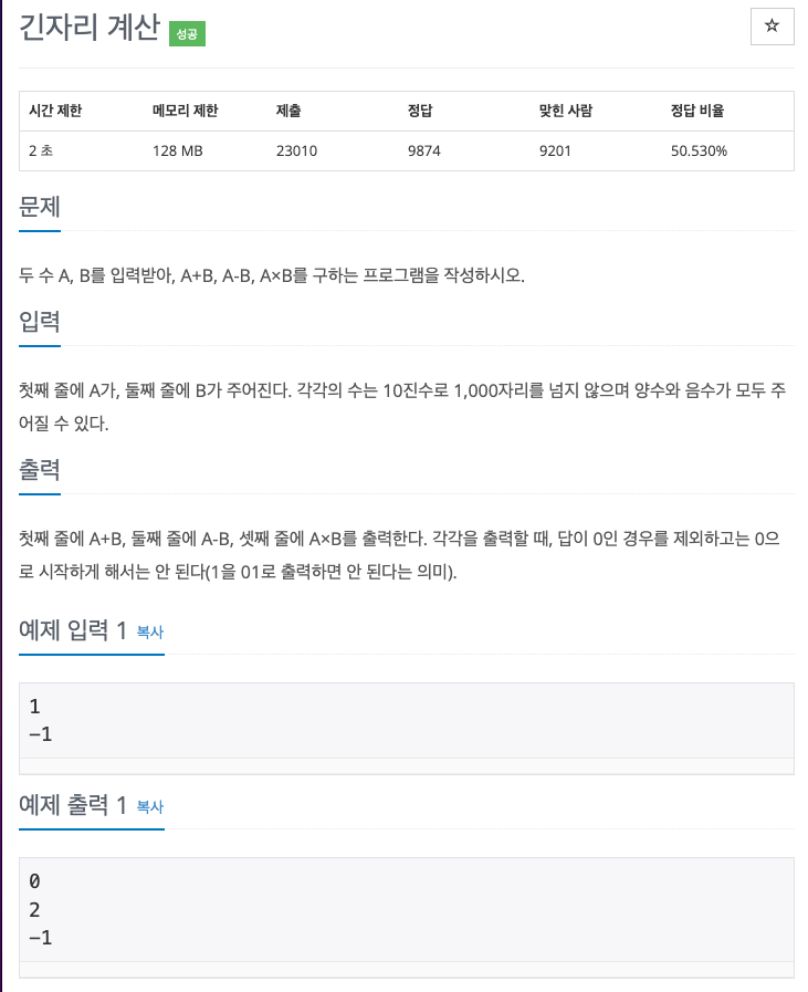 첫째 줄에 A+B, 둘째 줄에 A-B, 셋째 줄에 A×B를 출력한다. 각각을 출력할 때, 답이 0인 경우를 제외하고는 0으로 시작하게 해서는 안 된다(1을 01로 출력하면 안 된다는 의미).