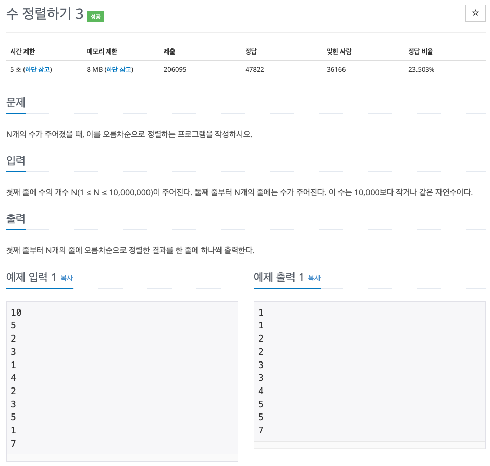 N개의 수가 주어졌을 때, 이를 오름차순으로 정렬하는 프로그램을 작성하시오.