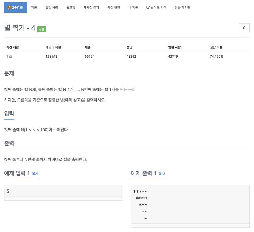 첫째 줄에는 별 N개, 둘째 줄에는 별 N-1개, ..., N번째 줄에는 별 1개를 찍는 문제