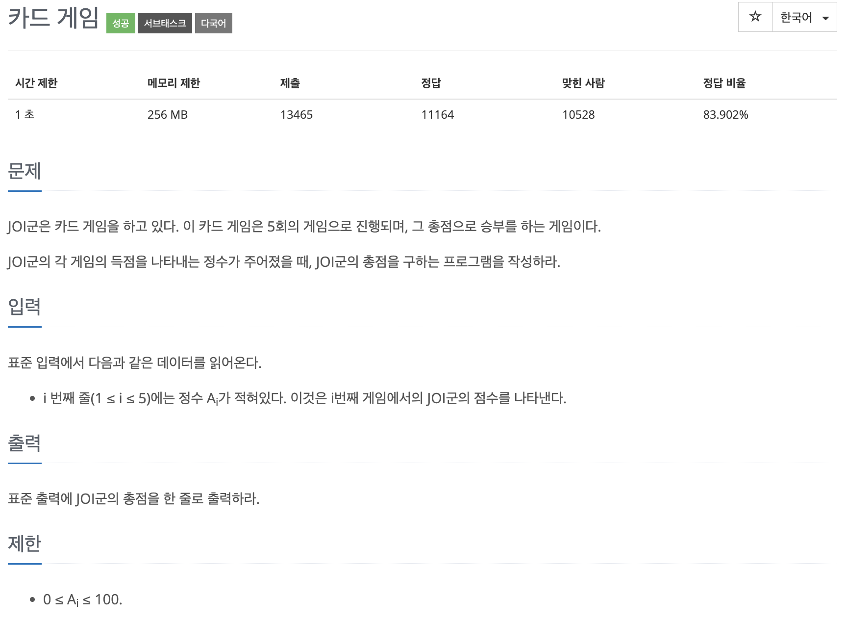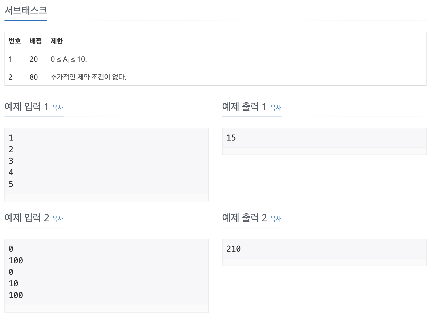 JOI군은 카드 게임을 하고 있다. 이 카드 게임은 5회의 게임으로 진행되며, 그 총점으로 승부를 하는 게임이다. JOI군의 각 게임의 득점을 나타내는 정수가 주어졌을 때, JOI군의 총점을 구하는 프