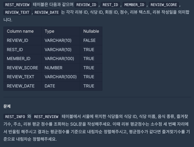 REST_REVIEW 테이블은 다음과 같으며 REVIEW_ID, REST_ID, MEMBER_ID, REVIEW_SCORE, REVIEW_TEXT,REVIEW_DATE는 각각 리뷰 ID, 식당 ID, 회원 ID, 점수, 리뷰 텍스트, 리뷰 작성일을 의미합니다.