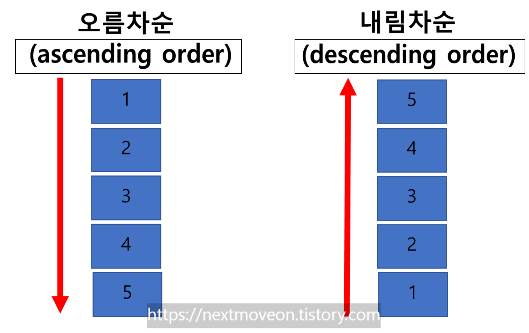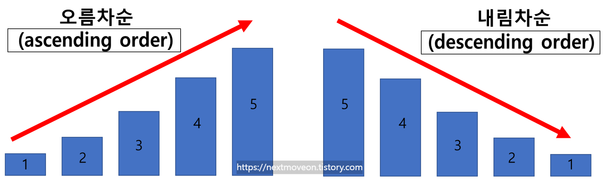 정렬한 결과물을 선그래프로 그렸을 때 값이 작은 것을 앞으로 정렬하면 그래프의 선이 올라가므로(↗) 오름차순이고 값이 큰 것을 앞으로 정렬하면 그래프의 선이 내려가므로(↘) 내림차순이라고 생각하면 된다. 어휘의 순서를 기반으로 가나다 → ABC 순으로 나열하는 경우에는 오름차순이고, 그 반대의 경우에는 내림차순에 해당한다.