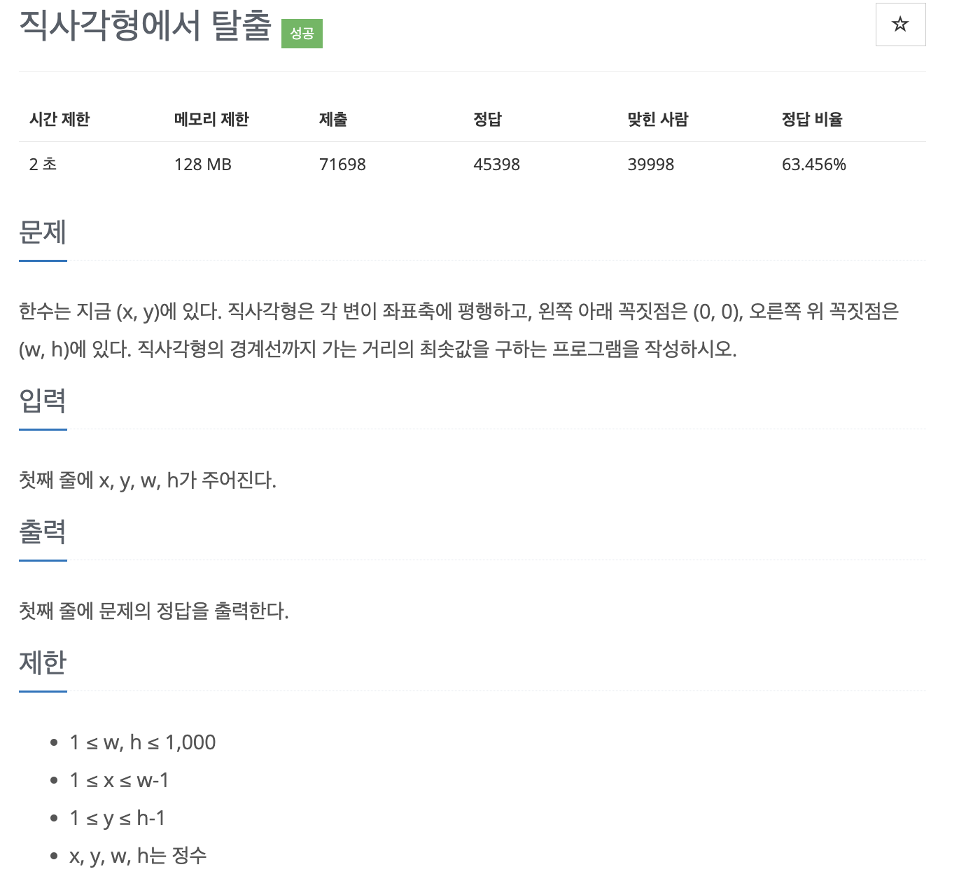 한수는 지금 (x, y)에 있다. 직사각형은 각 변이 좌표축에 평행하고, 왼쪽 아래 꼭짓점은 (0, 0), 오른쪽 위 꼭짓점은 (w, h)에 있다. 직사각형의 경계선까지 가는 거리의 최솟값을 구하는 프로그램을 작성하시오.