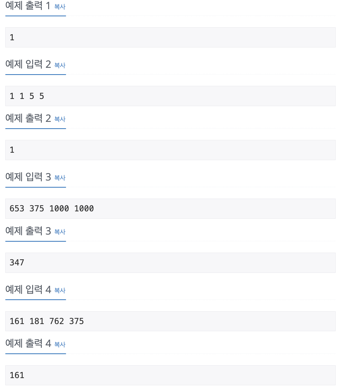 답 : 입력을 받고, 각각 math를 통해 min을 구해준다.
