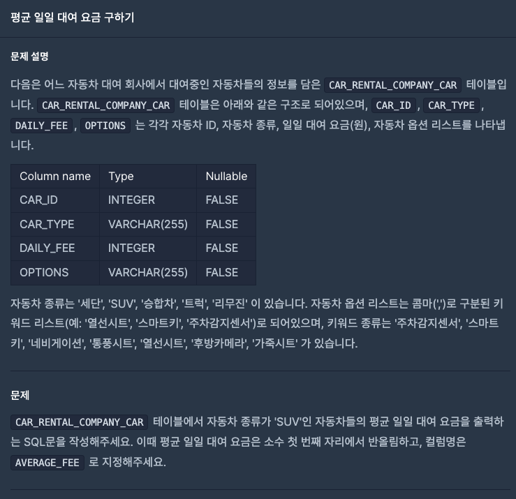 다음은 어느 자동차 대여 회사에서 대여중인 자동차들의 정보를 담은 CAR_RENTAL_COMPANY_CAR 테이블입니다. CAR_RENTAL_COMPANY_CAR 테이블은 아래와 같은 구조로 되어있으며, CAR_ID, CAR_TYPE, DAILY_FEE, OPTIONS 는 각각 자동차 ID, 자동차 종류, 일일 대여 요금(원), 자동차 옵션 리스트를 나타냅니다.