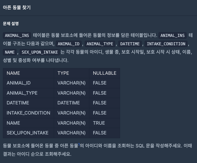 ANIMAL_INS 테이블은 동물 보호소에 들어온 동물의 정보를 담은 테이블입니다. ANIMAL_INS 테이블 구조는 다음과 같으며, ANIMAL_ID, ANIMAL_TYPE, DATETIME, INTAKE_CONDITION, NAME, SEX_UPON_INTAKE는 각각 동물의 아이디, 생물 종, 보호 시작일, 보호 시작 시 상태, 이름, 성별 및 중성화 여부를 나타냅니다.