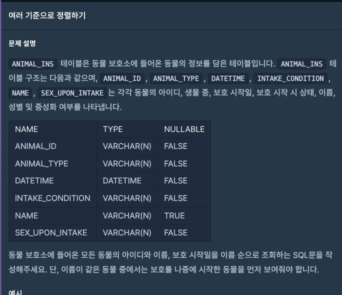 ANIMAL_INS 테이블은 동물 보호소에 들어온 동물의 정보를 담은 테이블입니다. ANIMAL_INS 테이블 구조는 다음과 같으며, ANIMAL_ID, ANIMAL_TYPE, DATETIME, INTAKE_CONDITION, NAME, SEX_UPON_INTAKE는 각각 동물의 아이디, 생물 종, 보호 시작일, 보호 시작 시 상태, 이름, 성별 및 중성화 여부를 나타냅니다.
