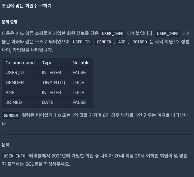WHERE JOINED LIKE "2021%" AND AGE >= 20 AND AGE <= 29;'algorithm > 프로그래머스' 카테고리의 다른 글