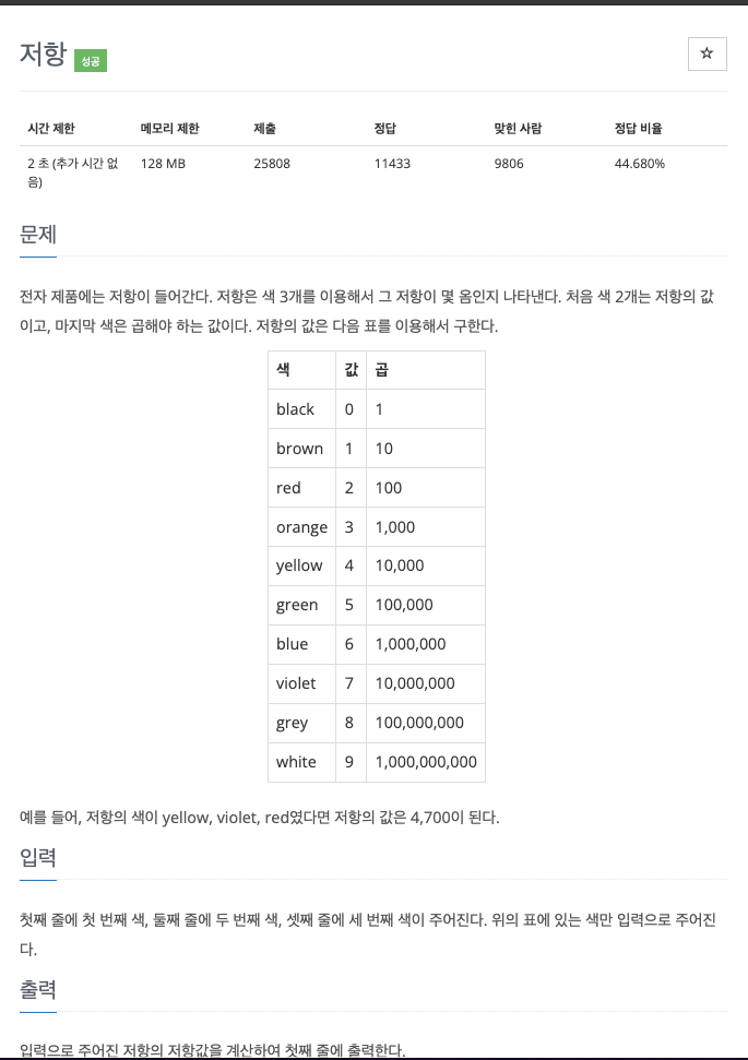 전자 제품에는 저항이 들어간다. 저항은 색 3개를 이용해서 그 저항이 몇 옴인지 나타낸다. 처음 색 2개는 저항의 값이고, 마지막 색은 곱해야 하는 값이다. 저항의 값은 다음 표를 이용해서 구한다.