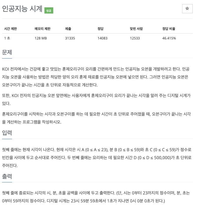 KOI 전자에서는 건강에 좋고 맛있는 훈제오리구이 요리를 간편하게 만드는 인공지능 오븐을 개발하려고 한다. 인공지능 오븐을 사용하는 방법은 적당한 양의 오리 훈제 재료를 인공지능 오븐에 넣으면 된다. 그러면 인공지능 오븐은 오븐구이가 끝나는 시간을 초 단위로 자동적으로 계산한다.