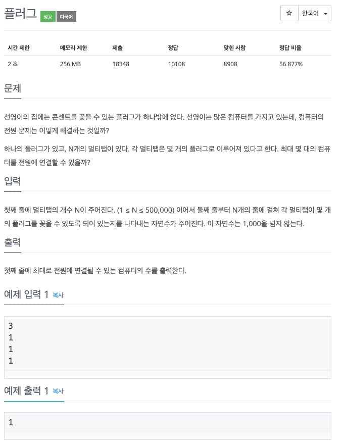 답 : 전부 더 한뒤,플러그의 수만큼 1씩 빼준다.