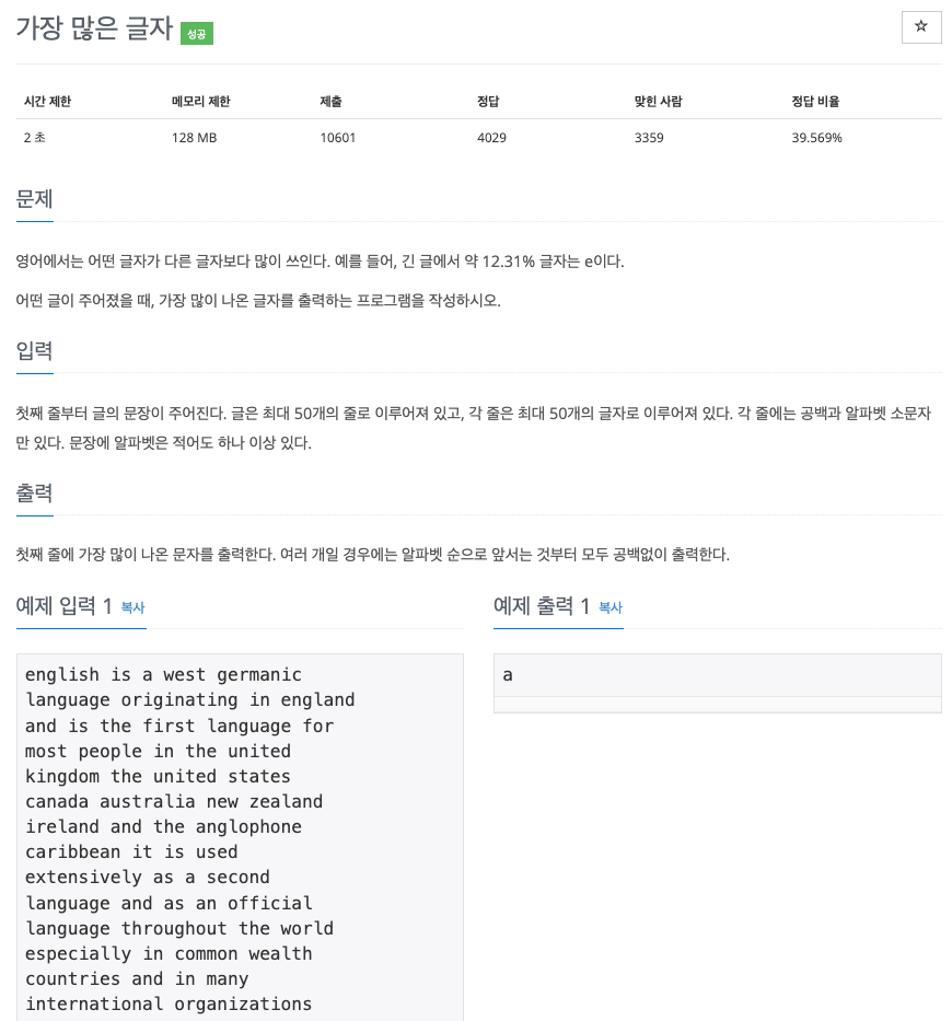 어떤 글이 주어졌을 때, 가장 많이 나온 글자를 출력하는 프로그램을 작성하시오.