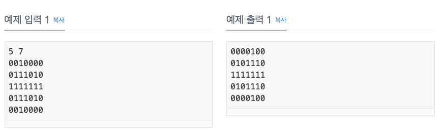 첫째 줄에는 두 개의 정수 N과 M(0≤N,M≤10)이 주어집니다. 둘째 줄부터 N개의 줄에 걸쳐 붕어빵의 모양이 주어집니다. 각 행에는 공백을 나타내는 ‘0‘ 또는 붕어빵을 나타내는 ‘1’이 총 M개 주어집니다.