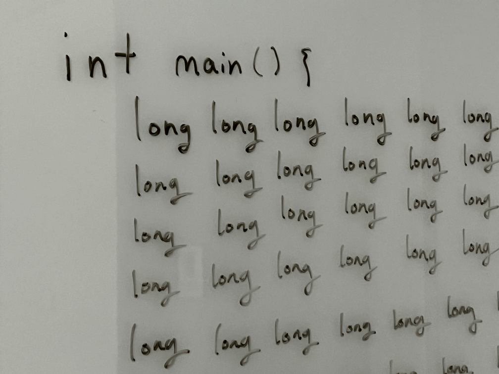 혜아는 책에 있는 정수 자료형과 관련된 내용을 기억해 냈다. 책에는 long int는 44바이트 정수까지 저장할 수 있는 정수 자료형이고 long long int는 88바이트 정수까지 저장할 수 있는 정수 자료형이라고 적혀 있었다. 혜아는 이런 생각이 들었다. “int 앞에 long을 하나씩 더 붙일 때마다 44바이트씩 저장할 수 있는 공간이 늘어나는 걸까? 분명 long long long int는 1212바이트, long long long long int는 1616바이트까지 저장할 수 있는 정수 자료형일 거야!” 그렇게 혜아는 당황하는 면접관의 얼굴을 뒤로한 채 칠판에 정수 자료형을 써 내려가기 시작했다.