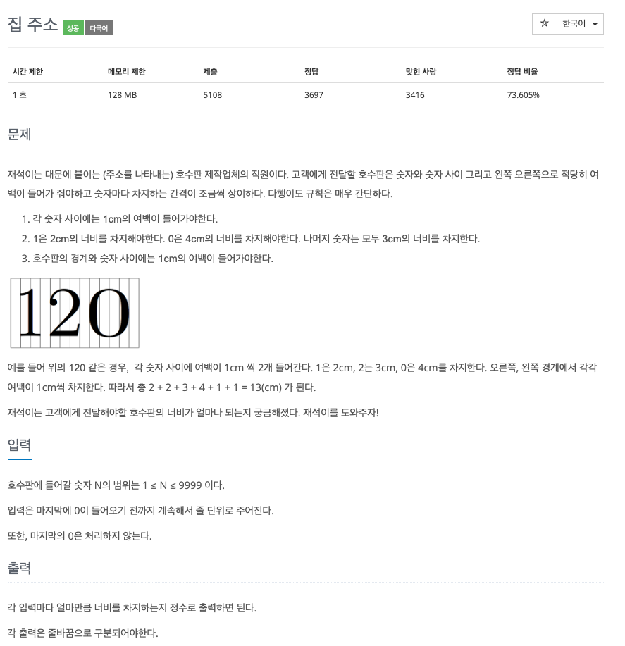 재석이는 대문에 붙이는 (주소를 나타내는) 호수판 제작업체의 직원이다. 고객에게 전달할 호수판은 숫자와 숫자 사이 그리고 왼쪽 오른쪽으로 적당히 여백이 들어가 줘야하고 숫자마다 차지하는 간격이 조금씩 상이하다. 다행이도 규칙은 매우 간단하다.