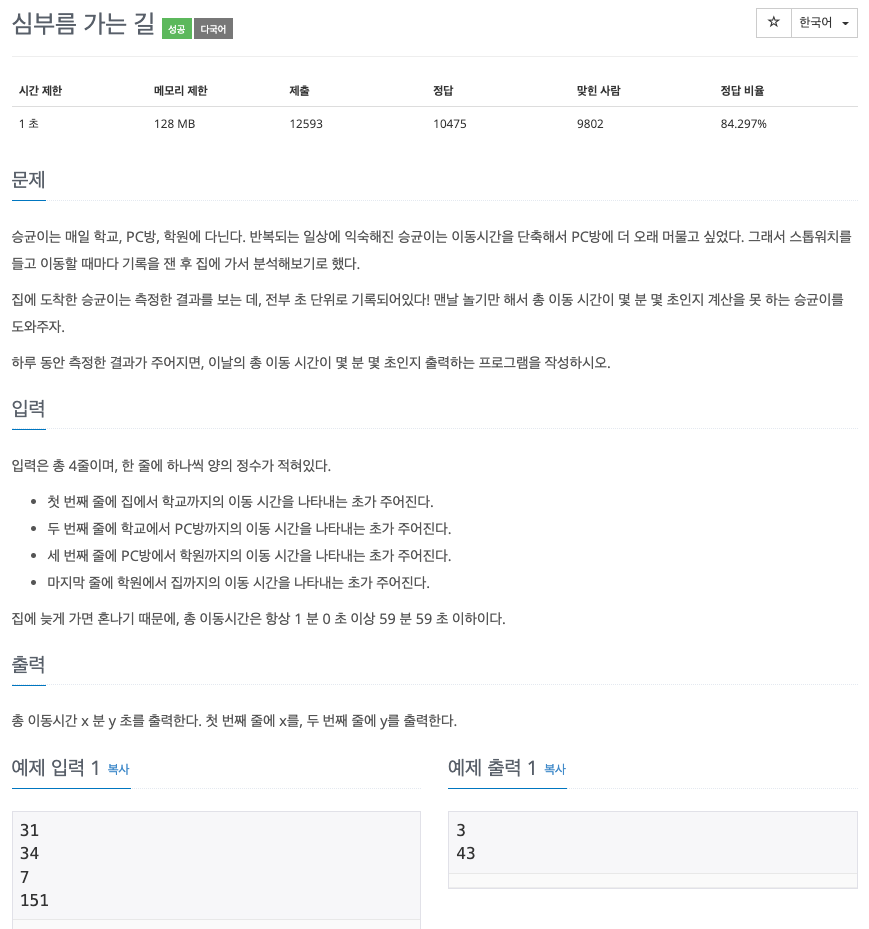집에 도착한 승균이는 측정한 결과를 보는 데, 전부 초 단위로 기록되어있다! 맨날 놀기만 해서 총 이동 시간이 몇 분 몇 초인지 계산을 못 하는 승균이를 도와주자.