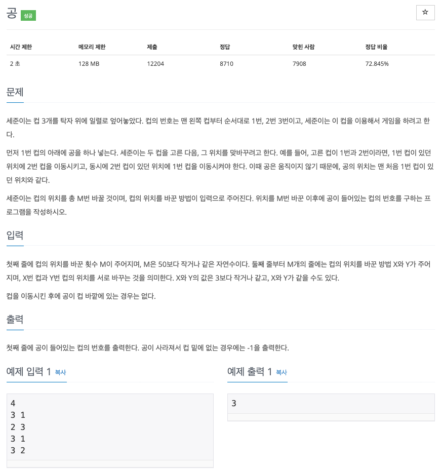 먼저 1번 컵의 아래에 공을 하나 넣는다. 세준이는 두 컵을 고른 다음, 그 위치를 맞바꾸려고 한다. 예를 들어, 고른 컵이 1번과 2번이라면, 1번 컵이 있던 위치에 2번 컵을 이동시키고, 동시에 2번 컵이 있던 위치에 1번 컵을 이동시켜야 한다. 이때 공은 움직이지 않기 때문에, 공의 위치는 맨 처음 1번 컵이 있던 위치와 같다.