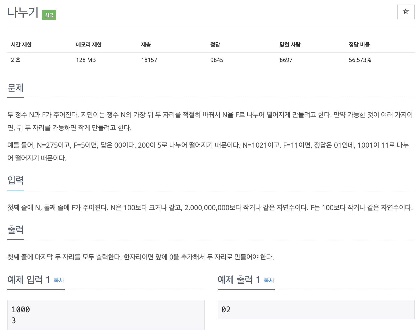 두 정수 N과 F가 주어진다. 지민이는 정수 N의 가장 뒤 두 자리를 적절히 바꿔서 N을 F로 나누어 떨어지게 만들려고 한다. 만약 가능한 것이 여러 가지이면, 뒤 두 자리를 가능하면 작게 만들려고 한다.