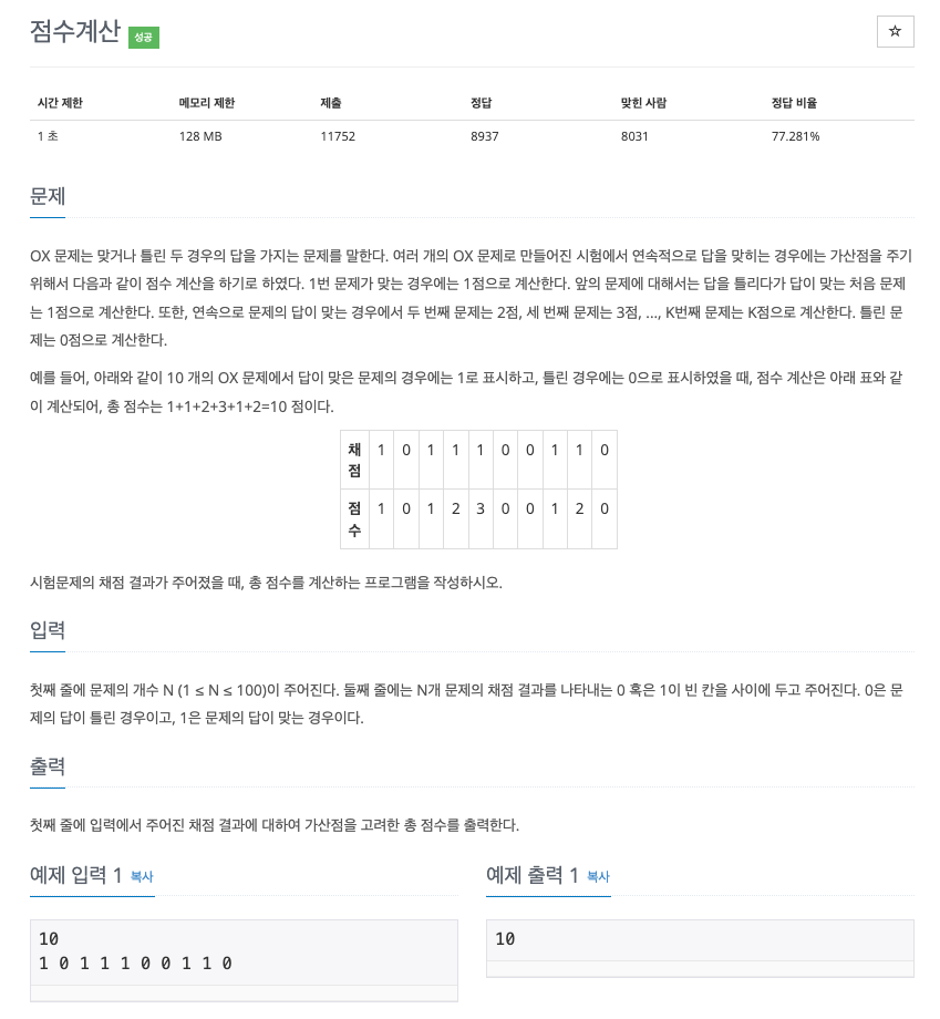 OX 문제는 맞거나 틀린 두 경우의 답을 가지는 문제를 말한다. 여러 개의 OX 문제로 만들어진 시험에서 연속적으로 답을 맞히는 경우에는 가산점을 주기 위해서 다음과 같이 점수 계산을 하기로 하였다. 1번 문제가 맞는 경우에는 1점으로 계산한다. 앞의 문제에 대해서는 답을 틀리다가 답이 맞는 처음 문제는 1점으로 계산한다. 또한, 연속으로 문제의 답이 맞는 경우에서 두 번째 문제는 2점, 세 번째 문제는 3점, ..., K번째 문제는 K점으로 계산한다. 틀린 문제는 0점으로 계산한다.