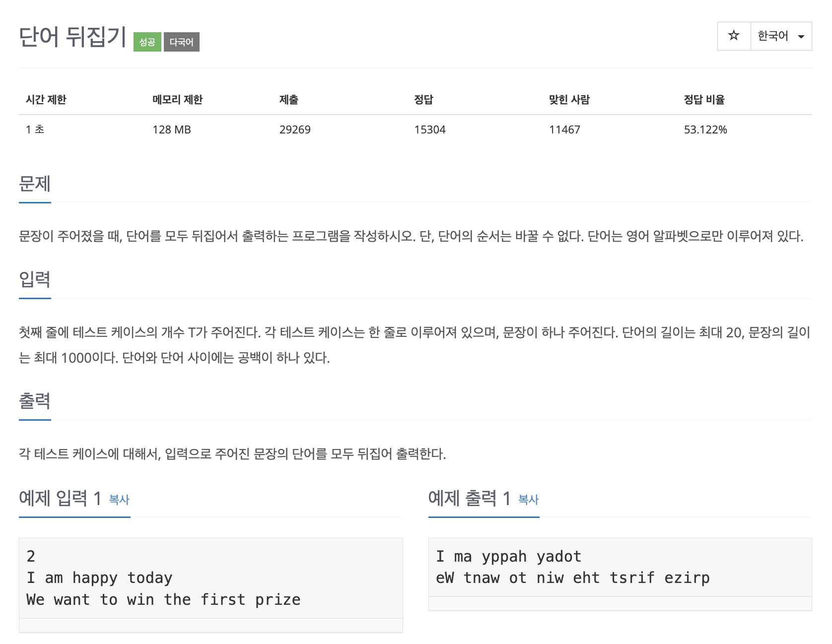 9093번: 단어 뒤집기