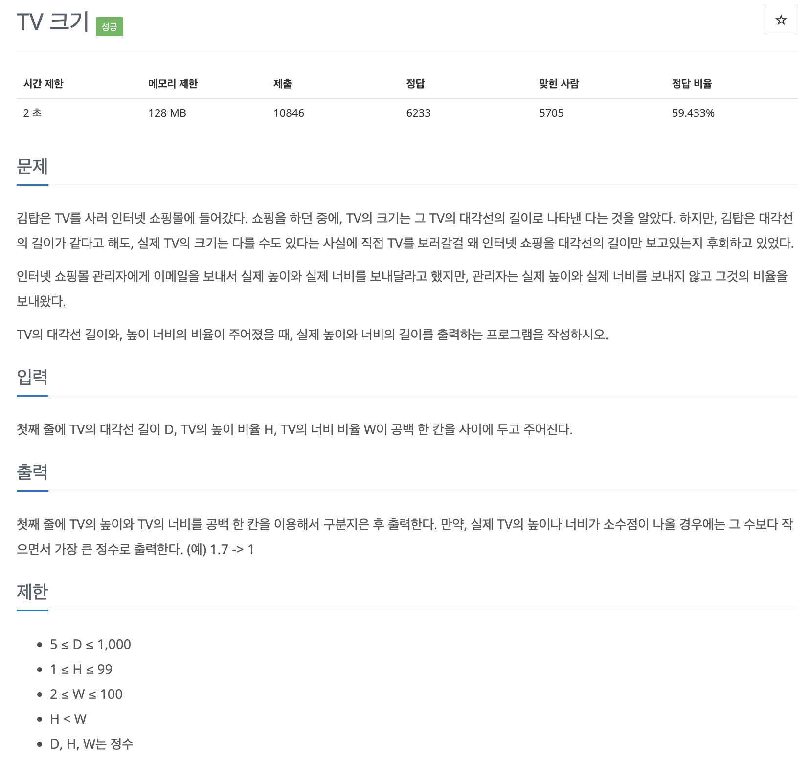 첫째 줄에 TV의 높이와 TV의 너비를 공백 한 칸을 이용해서 구분지은 후 출력한다. 만약, 실제 TV의 높이나 너비가 소수점이 나올 경우에는 그 수보다 작으면서 가장 큰 정수로 출력한다. (예) 1.7 -> 1