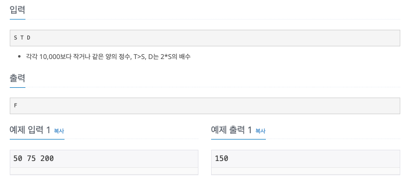 우리는 위에서 제시한 문제를 풀 수 있는 프로그램을 만들고 싶다. 하지만 우리의 컴퓨터는 안타깝게도 폰 노이만의 두뇌보다 성능이 좋지 못하기 때문에 무한급수를 이용하여 프로그램을 만들 수는 없다. 위에서 말한 “간단한 논리”를 이용하여 기차의 속도 S, 파리의 속도 T, 그리고 처음 두 기차 사이의 거리 D가 주어졌을 때 두 기차가 만날 때까지 파리의 이동거리 F를 계산하는 프로그램을 작성하라.