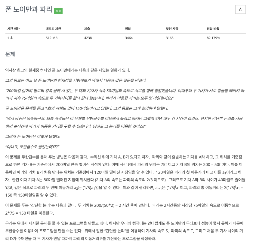 폰 노이만은 문제를 듣고 1초의 지체도 없이 150마일이라고 답했다. 그의 동료는 크게 실망하며 말했다.
