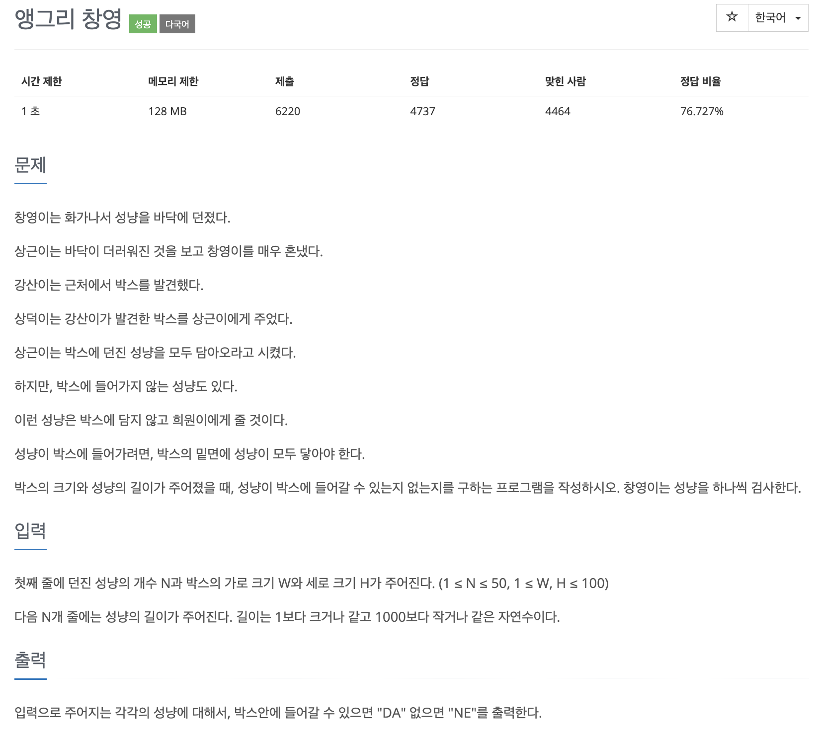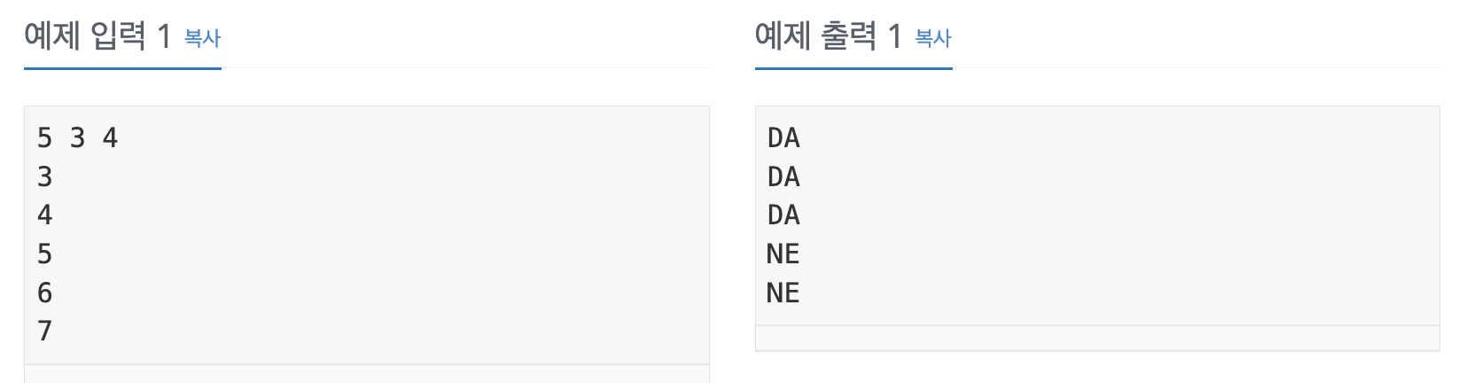 입력으로 주어지는 각각의 성냥에 대해서, 박스안에 들어갈 수 있으면 "DA" 없으면 "NE"를 출력한다.