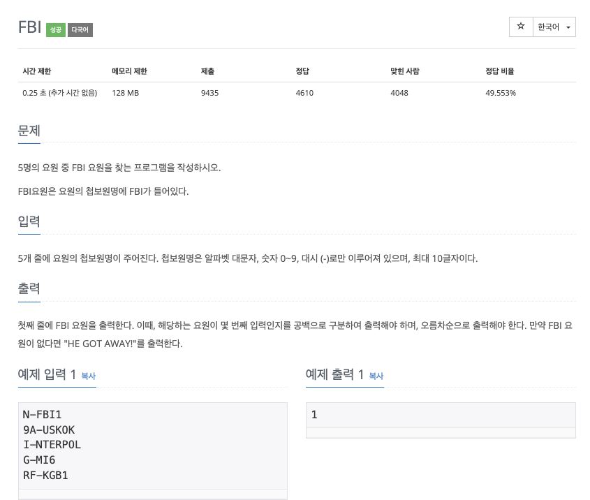 첫째 줄에 FBI 요원을 출력한다. 이때, 해당하는 요원이 몇 번째 입력인지를 공백으로 구분하여 출력해야 하며, 오름차순으로 출력해야 한다. 만약 FBI 요원이 없다면 "HE GOT AWAY!"를 출력한다.
