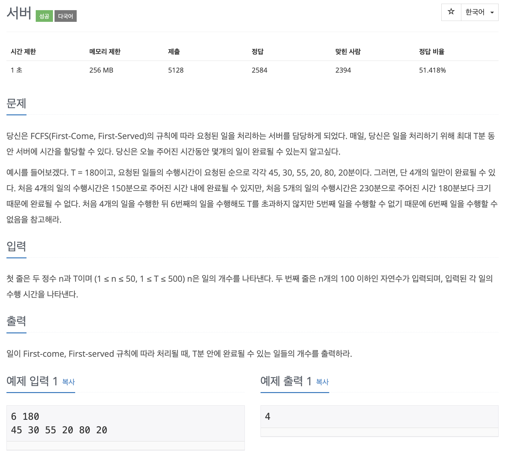 당신은 FCFS(First-Come, First-Served)의 규칙에 따라 요청된 일을 처리하는 서버를 담당하게 되었다. 매일, 당신은 일을 처리하기 위해 최대 T분 동안 서버에 시간을 할당할 수 있다. 당신은 오늘 주어진 시간동안 몇개의 일이 완료될 수 있는지 알고싶다.