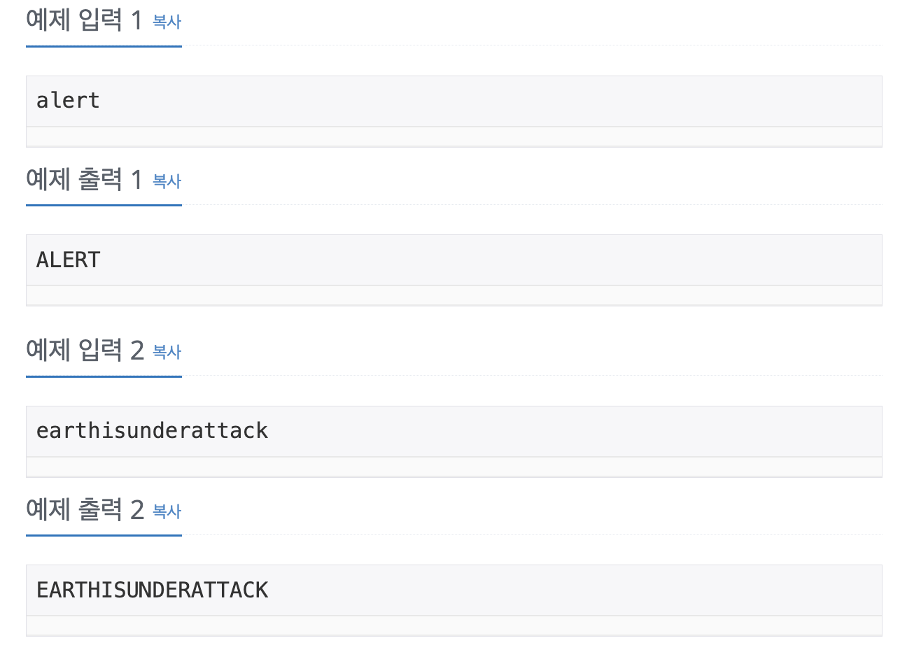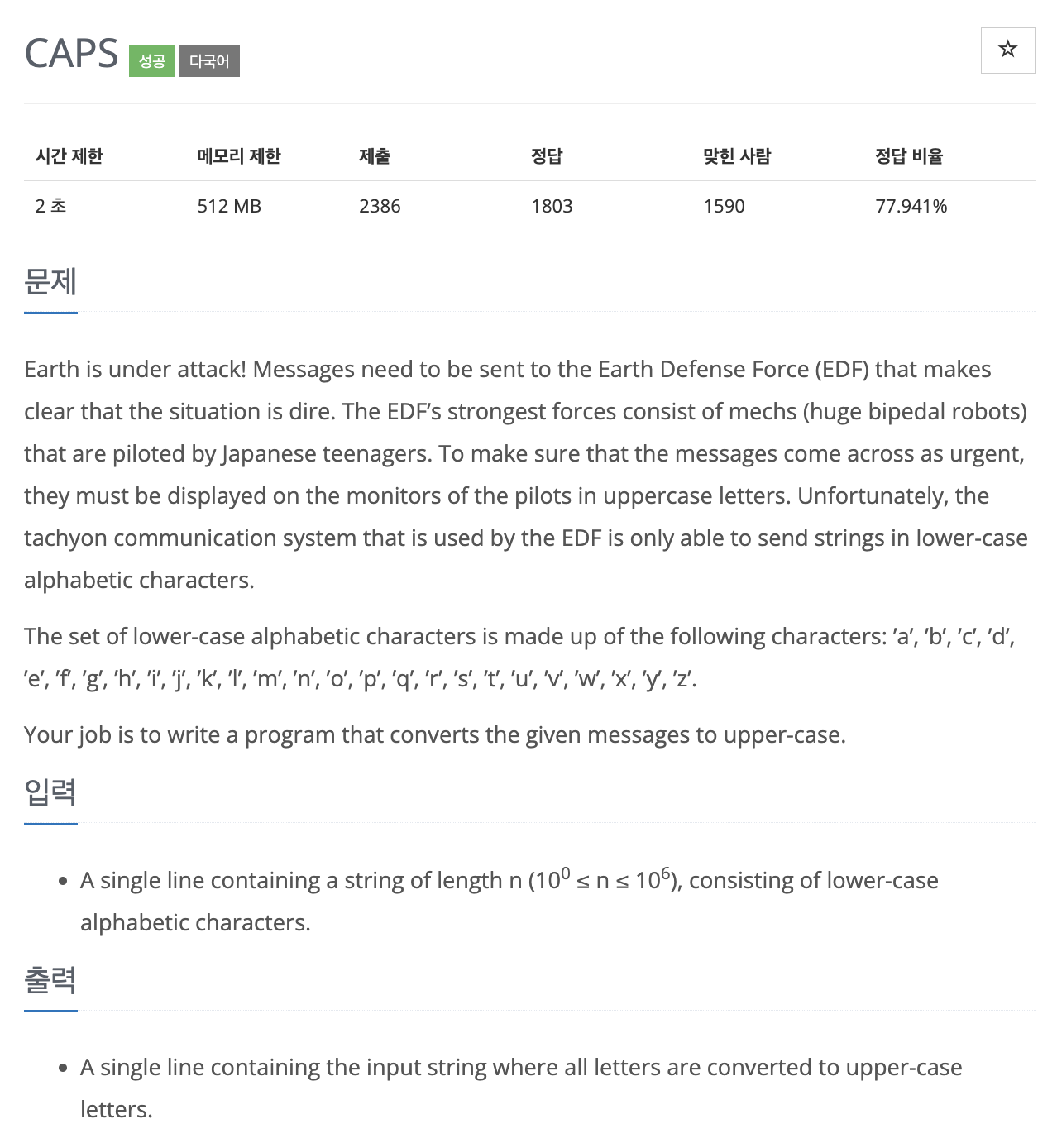 Earth is under attack! Messages need to be sent to the Earth Defense Force (EDF) that makes clear that the situation is dire. The EDF’s strongest forces consist of mechs (huge bipedal robots) that are piloted by Japanese teenagers. To make sure that the messages come across as urgent, they must be displayed on the monitors of the pilots in uppercase letters. Unfortunately, the tachyon communication system that is used by the EDF is only able to send strings in lower-case alphabetic characters.