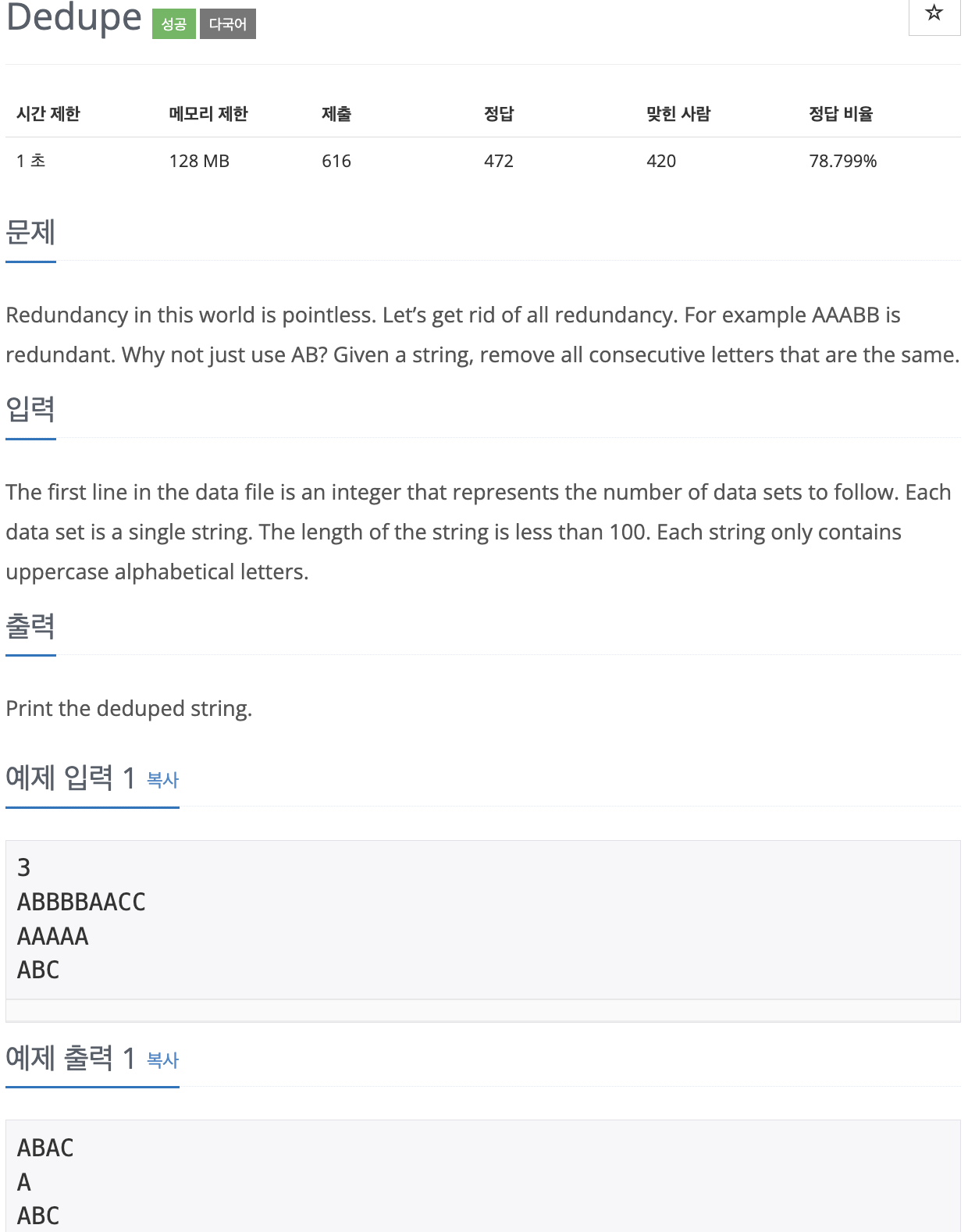 답 : 이전 문자와 비교하여 중복 문자를 제거하고, 저장한 뒤 출력한다.