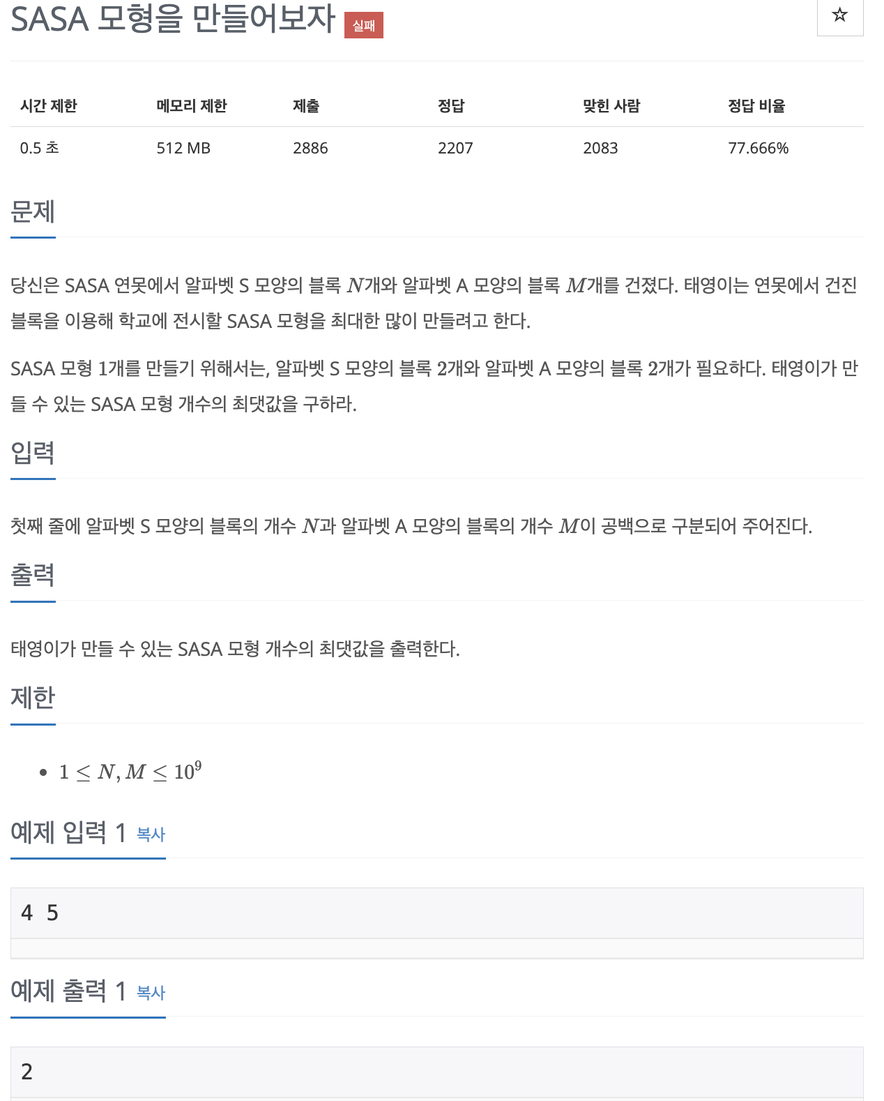 당신은 SASA 연못에서 알파벳 S 모양의 블록 N�개와 알파벳 A 모양의 블록 M�개를 건졌다. 태영이는 연못에서 건진 블록을 이용해 학교에 전시할 SASA 모형을 최대한 많이 만들려고 한다.