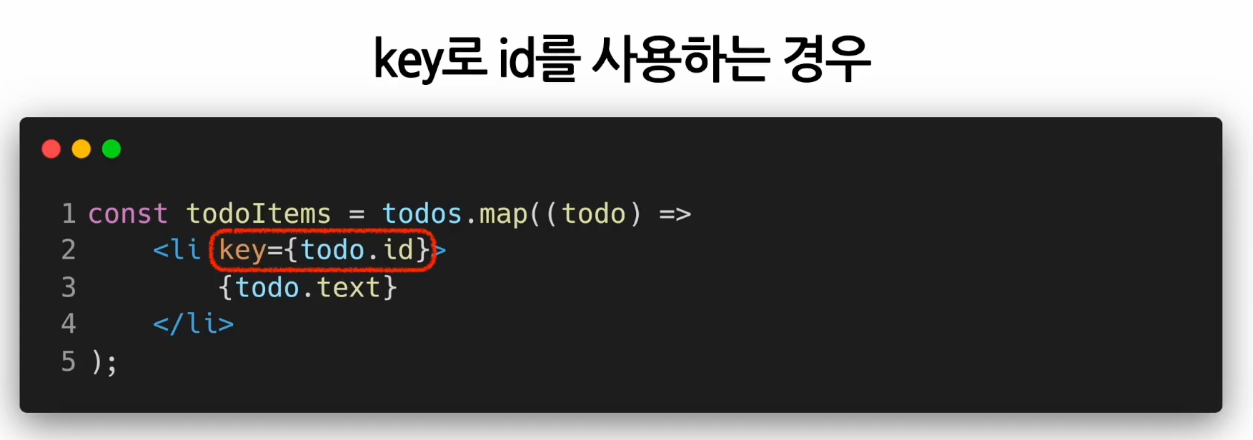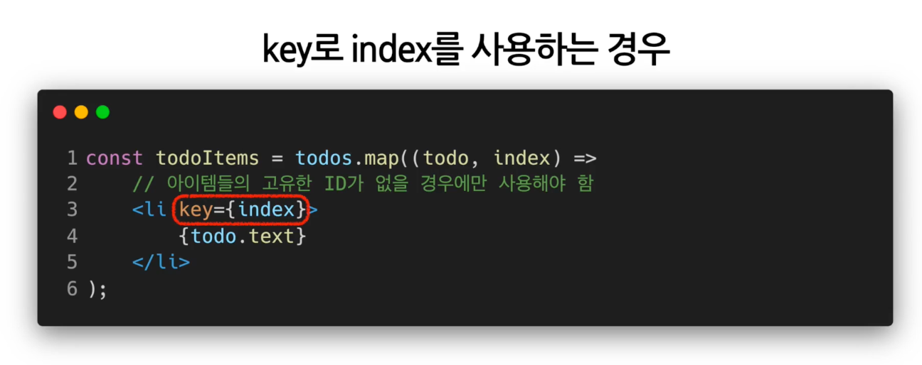 index도 사용가능하지만 배열 아이템의 현재 index를 의미하고 고유한 값이라 key값으로 사용이 가능하지만 배열에서 아이템의 순서가 바뀔 수 있는 경우에는 key로 index를 쓰는 것을 권장하지 않는다. 성능에 부정적인 영향, 문제가 있을 수 있다.