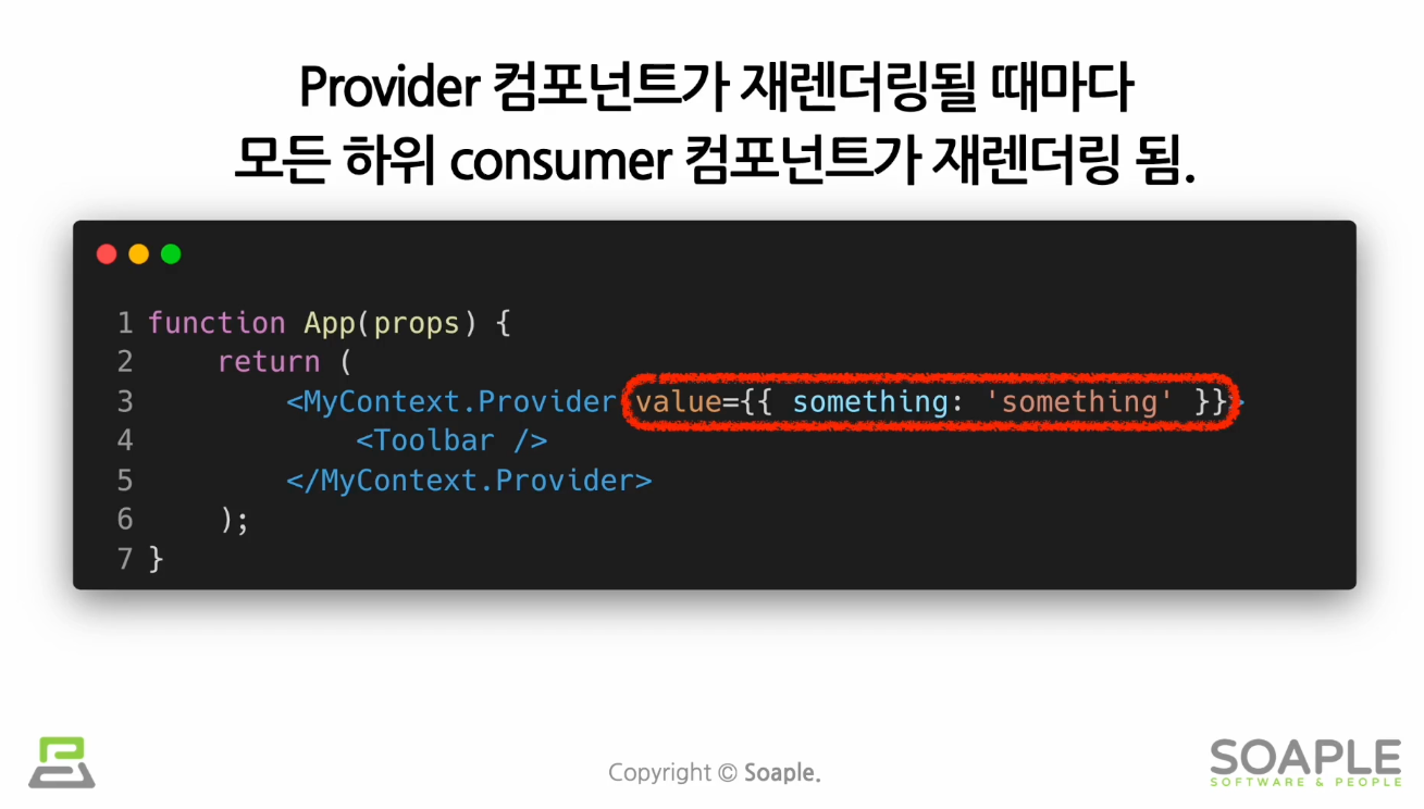 Provider 컴포넌트가 재렌더링 될 때마다 모든 하위 consumer 컴포넌트가 재렌더링 됨.