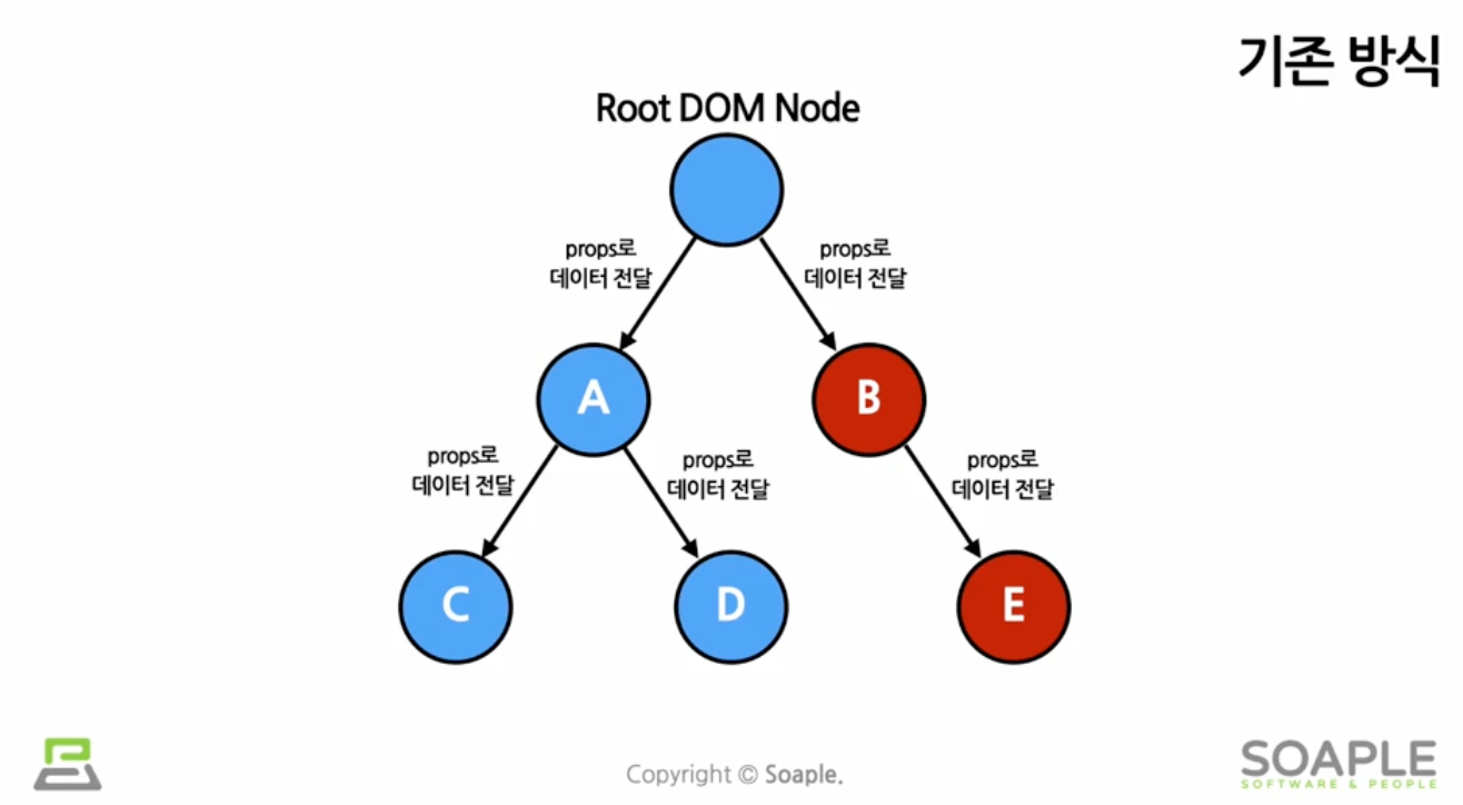 기존 일반적인 React는 일반적으로 컴포넌트의 props를 통한 데이터 전달 부모에서 자식으로 단방향.