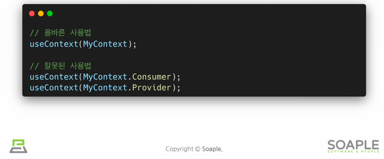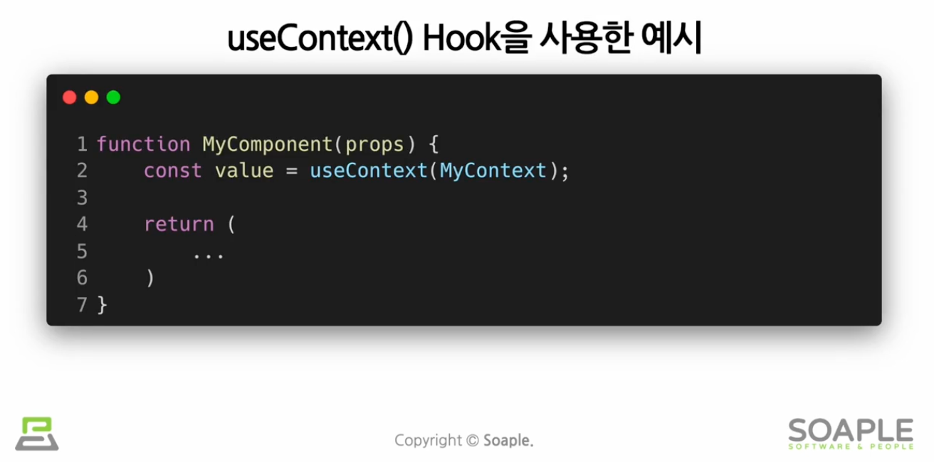 함수컨포넌트에서 컨텍스트 사용시 매번 감싸주는 것보다 Hook을 쓰는게 더 좋다.