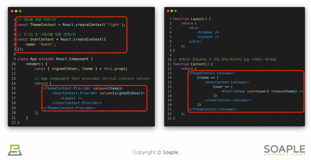 Context.Provider 를 중첩하여 구현한다. 2개 또는 그 이상이 컨텍스트의 값이 자주 함께 사용될 경우 모든 값을 한번에 제공하는 별도의 랜더프랍을 만들어 하는 것이 좋다.