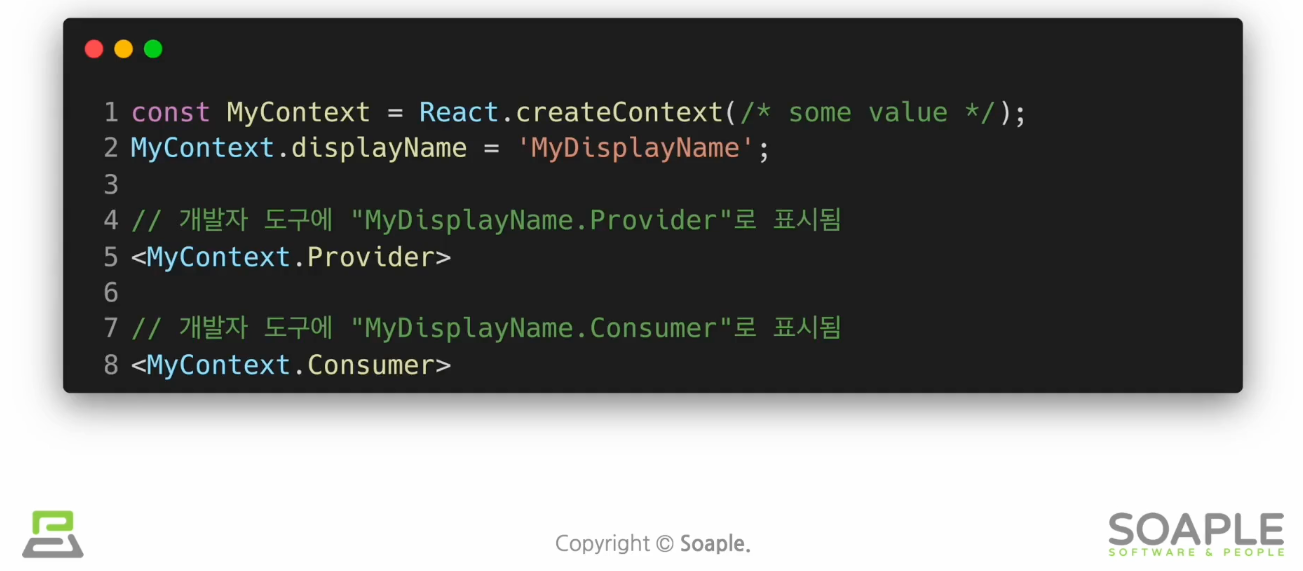 Context.displayName : 컨텍스트 객체는 displayName 이라는 문자열 속성을 가진다. 크롬의 React 개발자 도구에서는 컨텍스트의 Provider나 Consumer를 표시할 때 displayName를 함께 표시해준다.