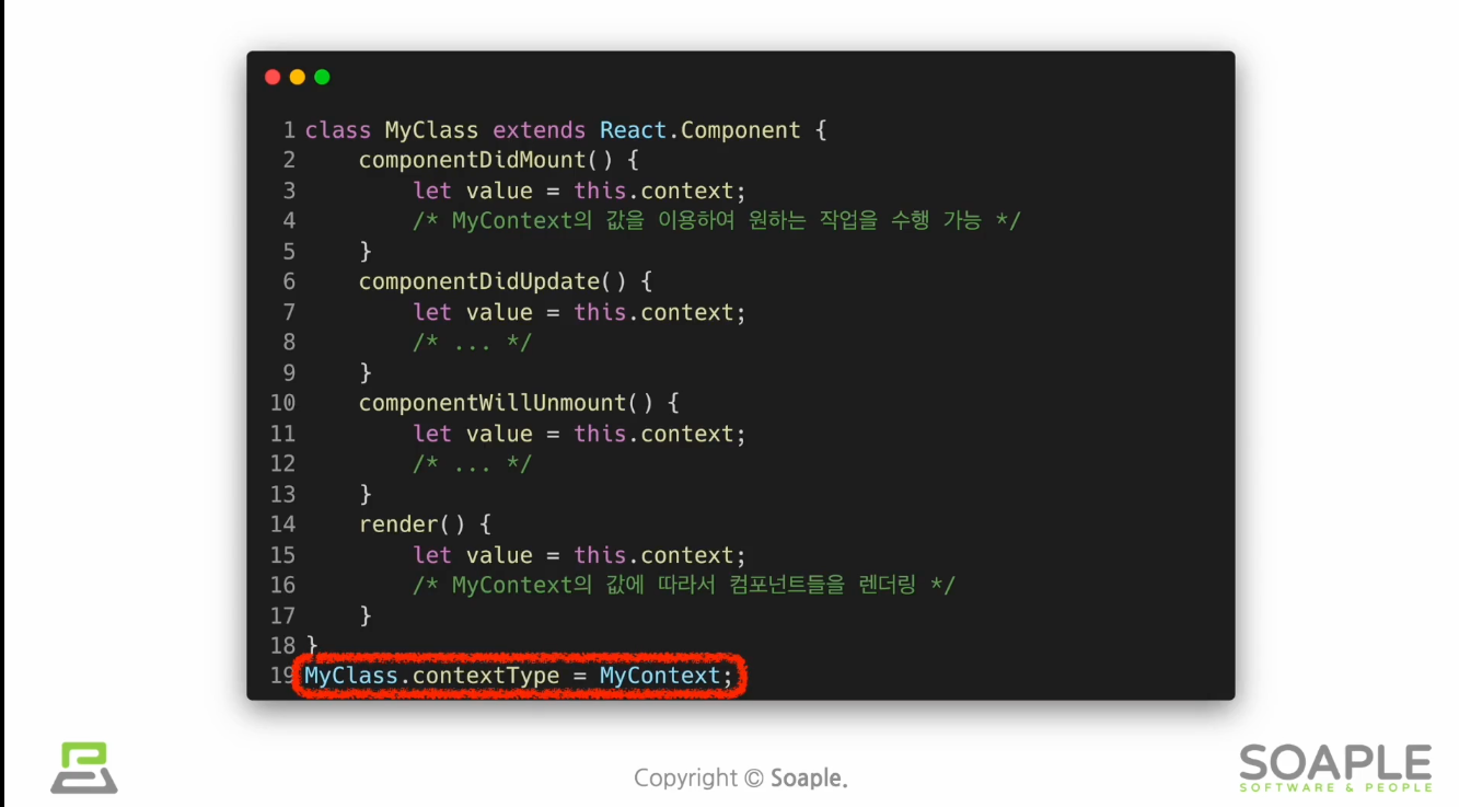 Class.contextType 프로바이더 하위에 있는 클래스 컴포넌트에서 컨텍스트의 데이터에 접근하기 위해 사용함.